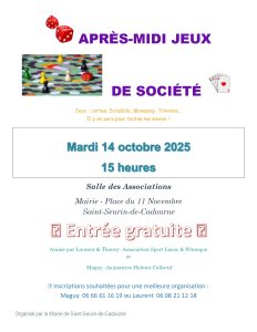 Venez partager en toute convivialité un moment de jeux à la salle des associations (à côté de la mairie) le Mardi 14 Octobre à 15h.