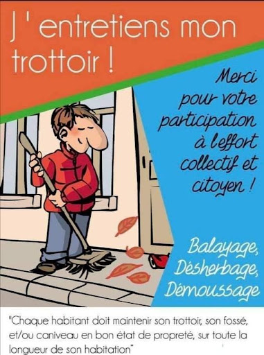 La loi impose à tous les habitants de nettoyer le trottoir et le caniveau au droit de leur habitation. La balayeuse passe régulièrement dans les rues et assainit quant à elle les caniveaux.